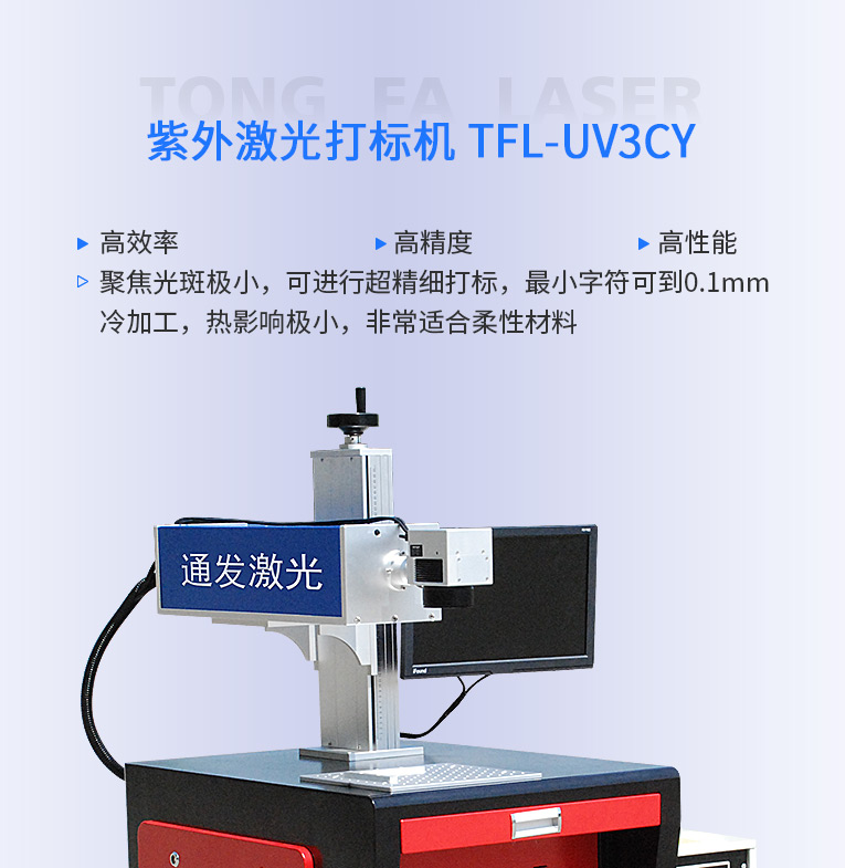 通發(fā)紫外激光打標(biāo)機聚焦光斑極小,可進(jìn)行超精細(xì)打標(biāo),最小字符可到0.1MM,冷加工,熱影響極小,不會有明顯燒痕,非常適合柔性材料、玻璃PCB標(biāo)識、特殊材料等高品質(zhì)打標(biāo)加工