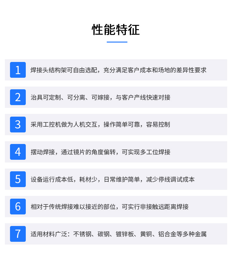 加工頭:激光頭可實(shí)現(xiàn)±60度旋轉(zhuǎn),效率高,可實(shí)現(xiàn)產(chǎn)品多角度焊接,適用性強(qiáng)。